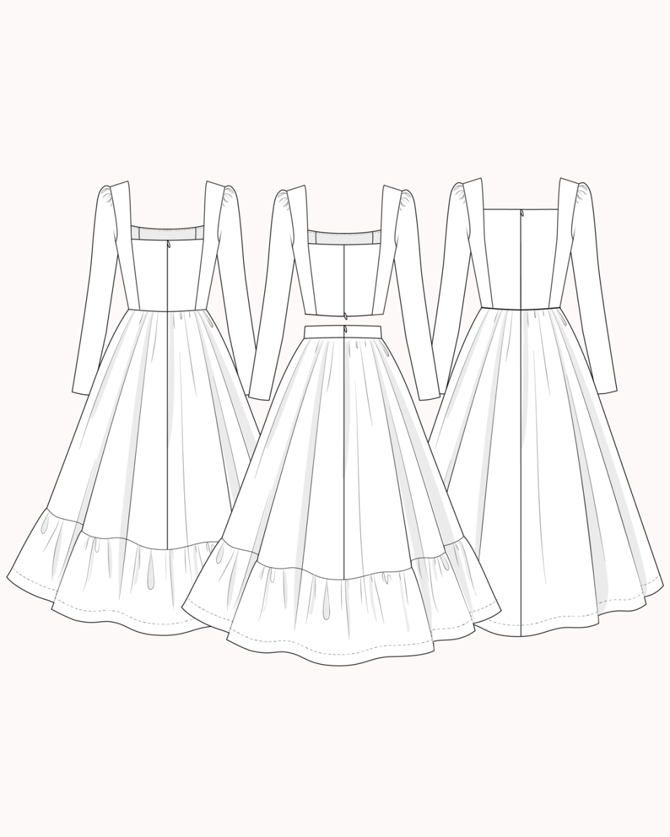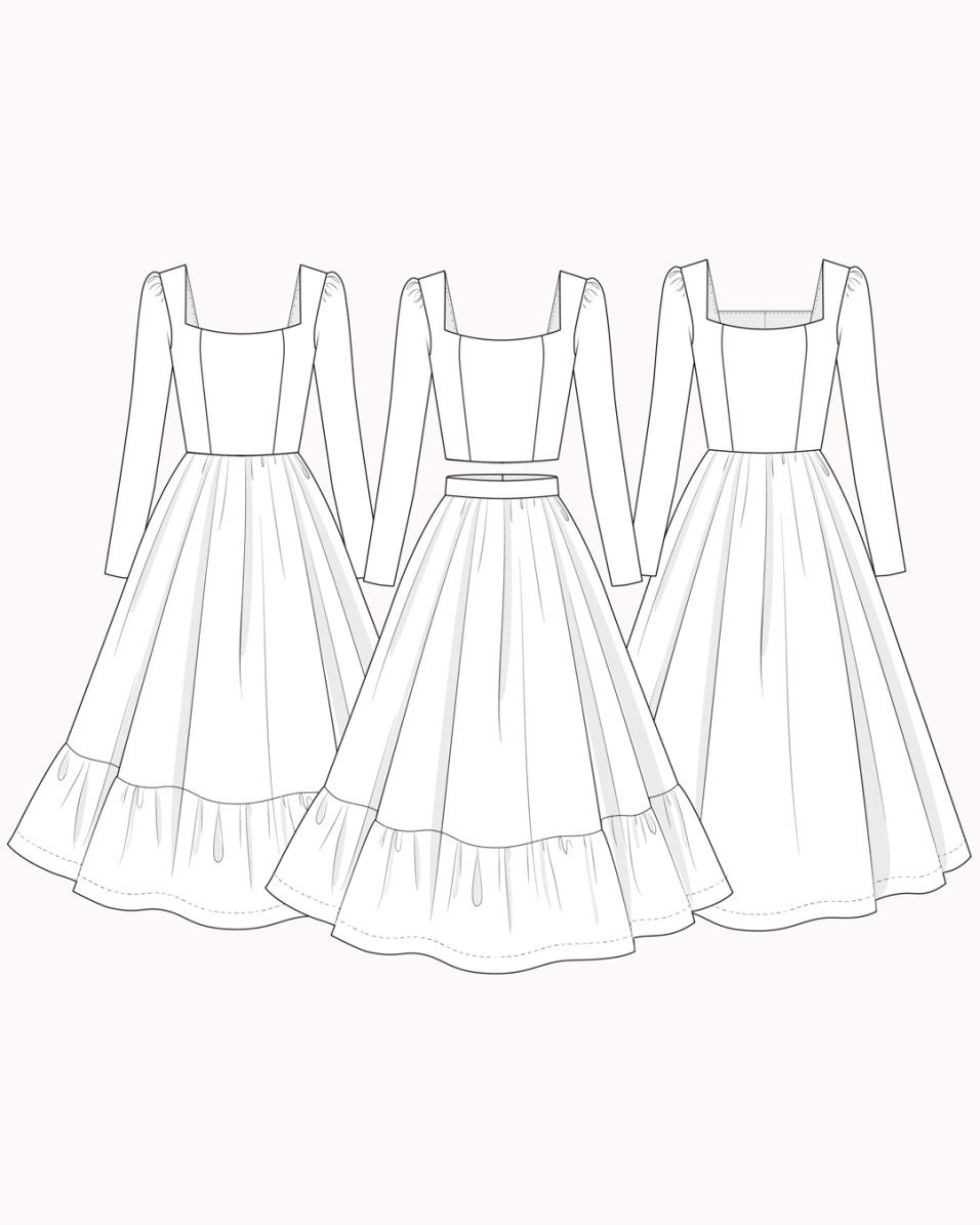 The Antoinette with sleeves extension include 4 different pieces from the original pattern and an all new explanatory guide. It is possible to sew the Antoinette top and dress with sleeves only if you have already bought the original Antoinette design pattern. If not, you will miss one piece for the bodice and the skirts’ ones.