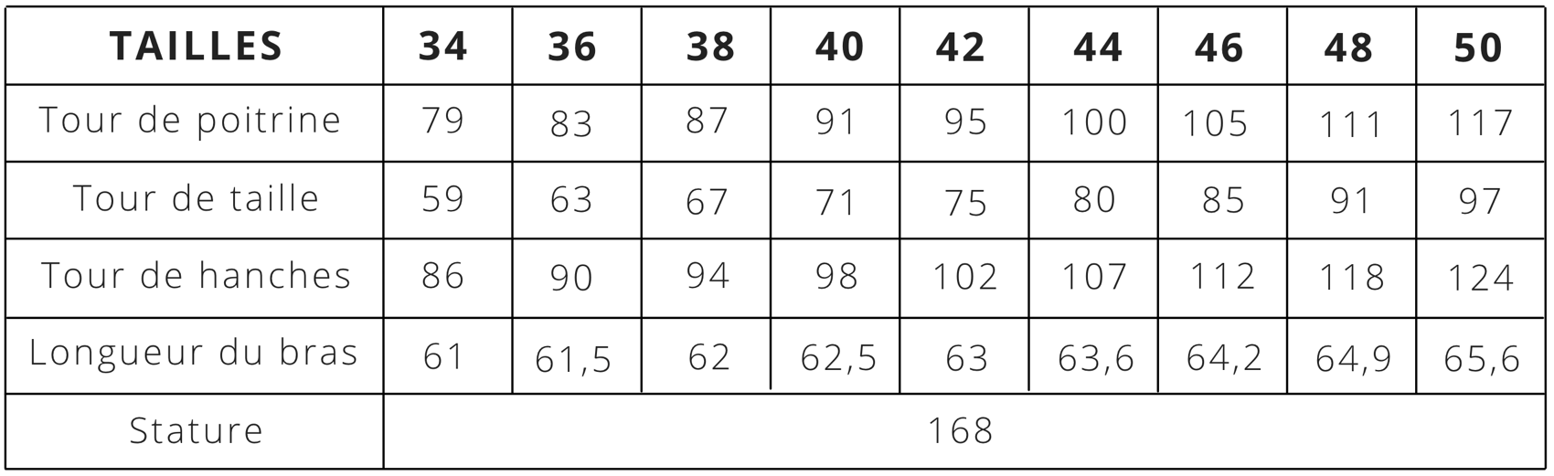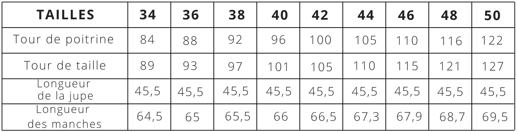 • Une planche de patron comportant le tracé de toutes les tailles, sans chevauchements, imprimée en couleurs sur un papier de 70 grammes