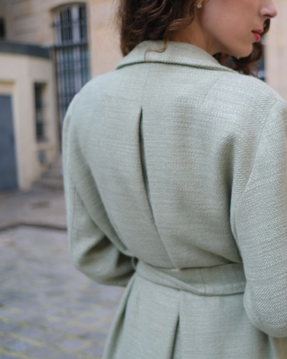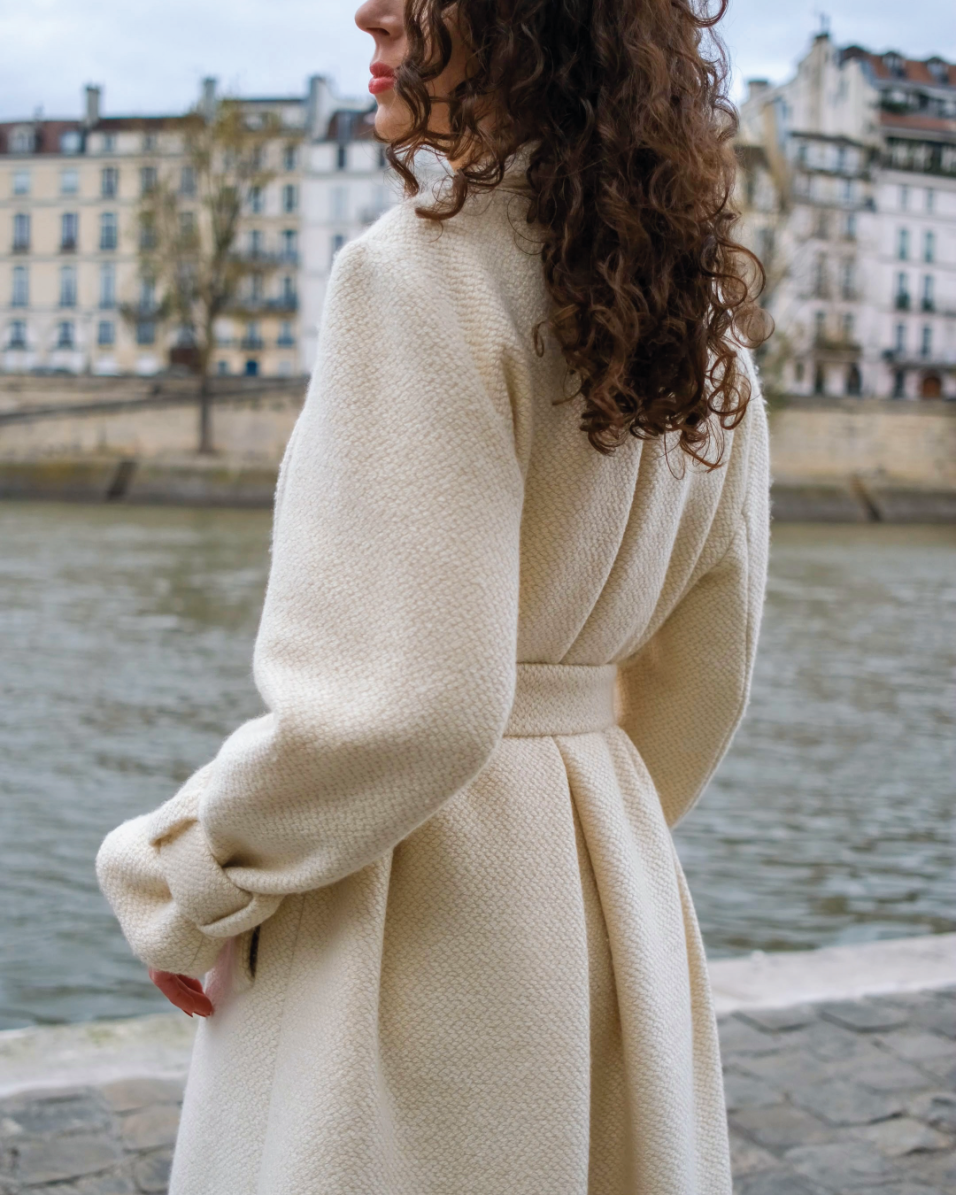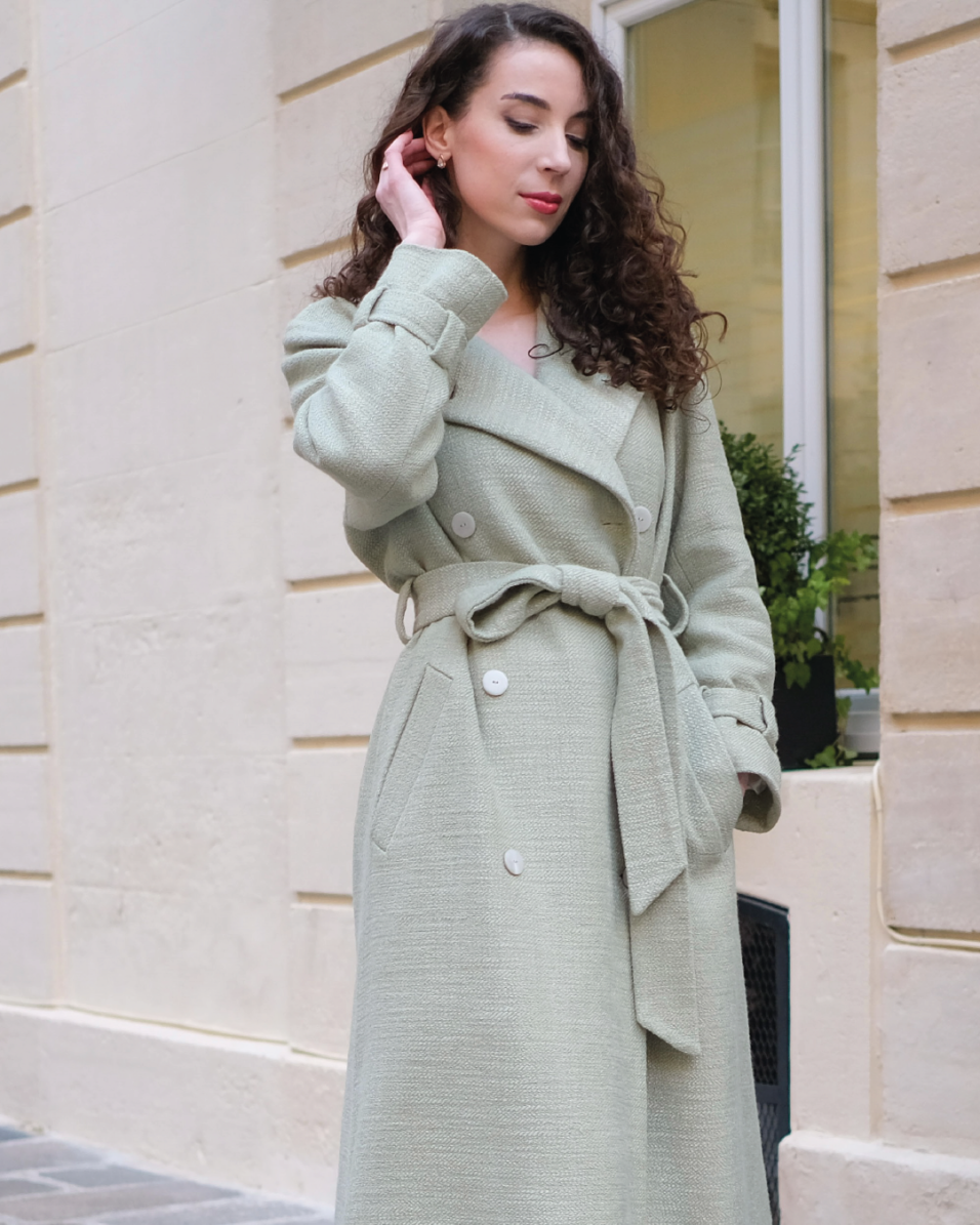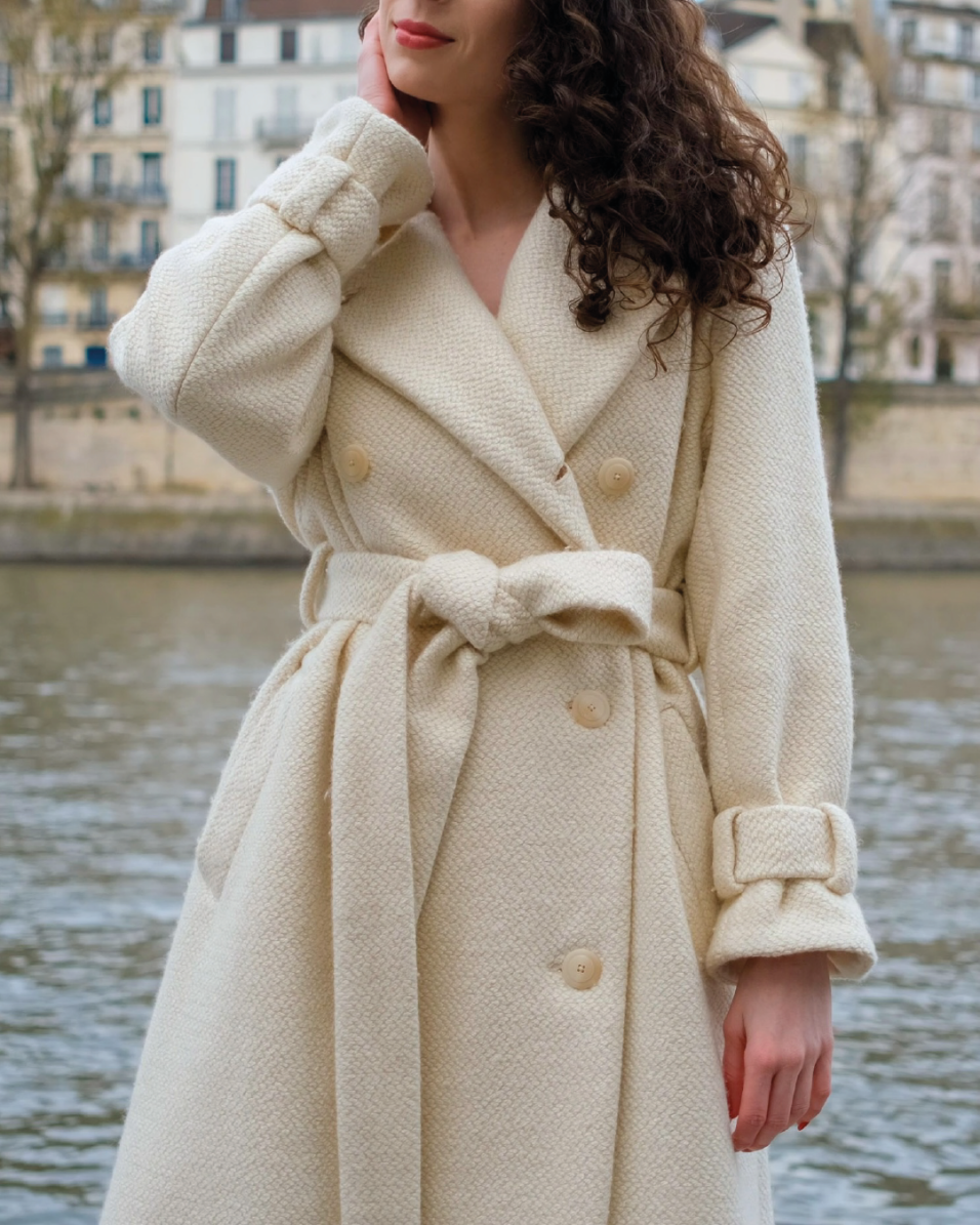 Le modèle Bénédicte est le premier vêtement d’extérieur que je vous propose ! Élégant, raffiné, intemporel, il se fera l’incontournable de votre garde-robe. C’est un manteau trench croisé, ceinturé à la taille, présentant un ravissant pli creux dans le dos, que l’on peut porter boutonné jusqu’à l’encolure ou bien ouvert. Une fois enfilé, sa coupe aux inspirations vintage vous confèrera une allure distinguée sans effort. Déclinable en trench demi-saison ou en manteau hivernal, Bénédicte vous permettra de varier les projets. À vous de l’interpréter à souhait au fil des saisons !